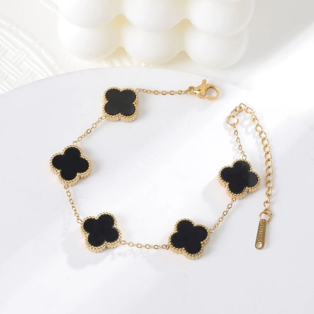 Crafted from stainless steel and coated with 18K gold, this black clover charm bracelet offers a sleek, luxurious look. Anti-tarnish and skin-friendly—perfect for everyday elegance or festive styling.