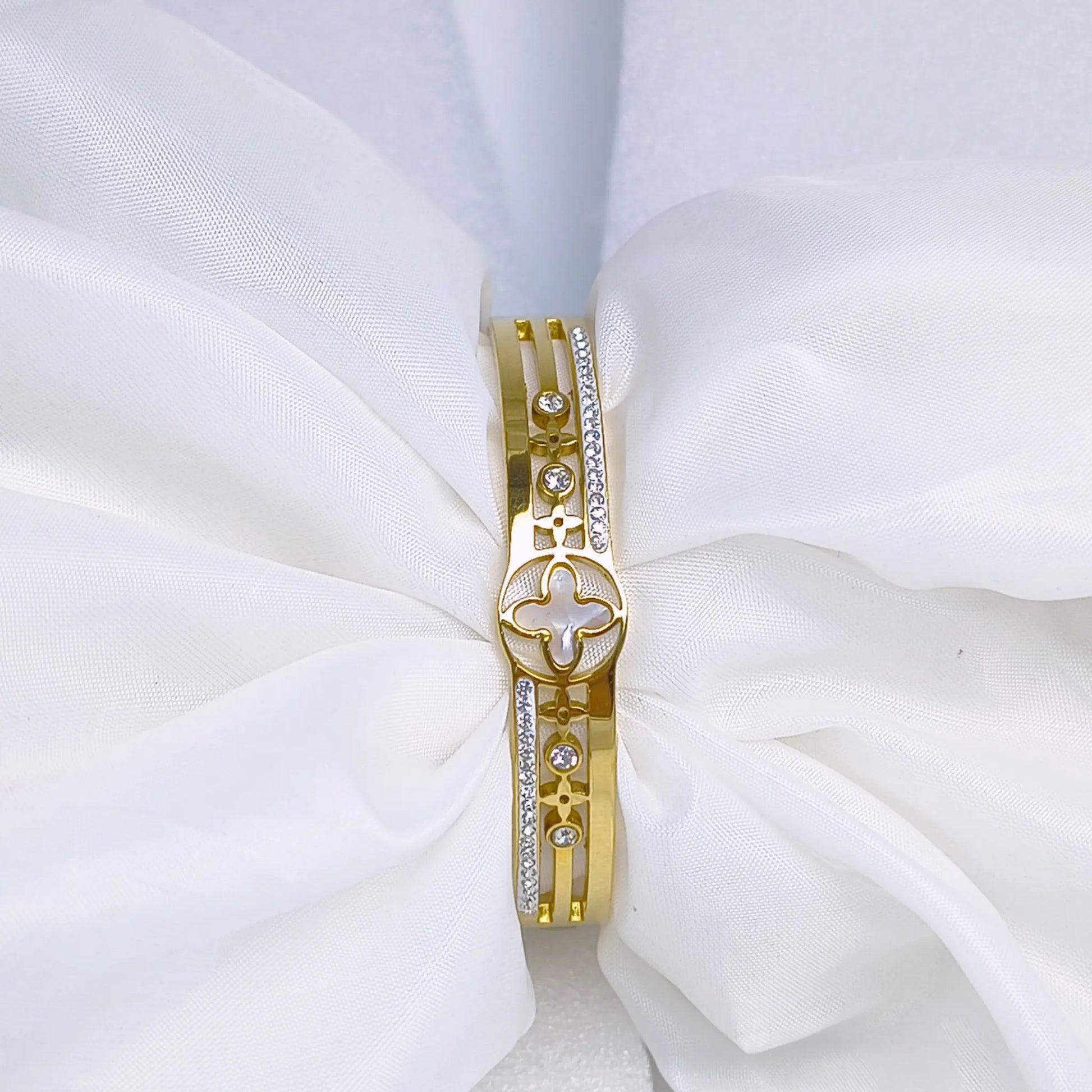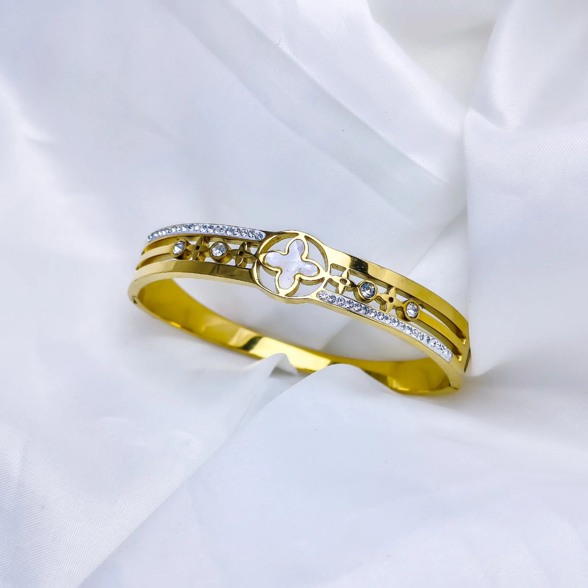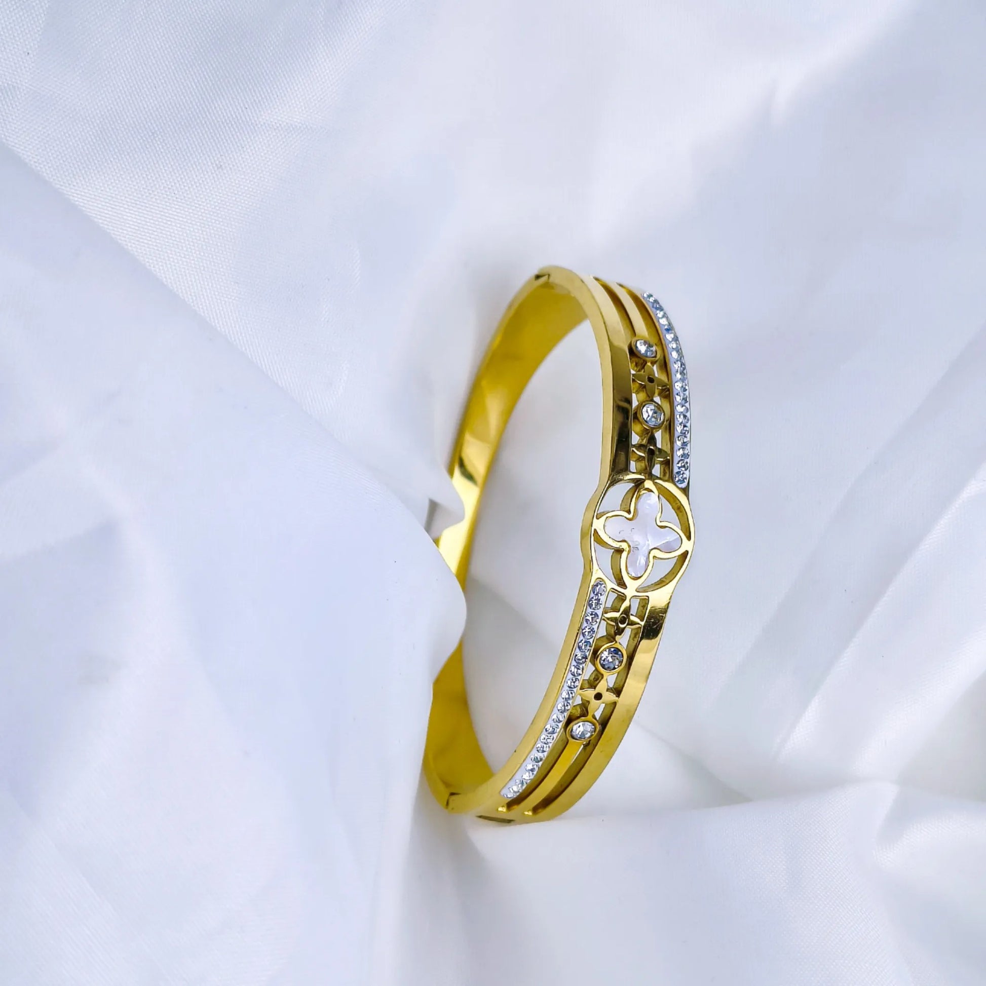 Shine with sophistication wearing this Anti Tarnish Gold Plated Kada Bracelet, beautifully crafted with sparkling white stones and a designer floral motif. Its premium gold polish and anti tarnish finish ensure long-lasting shine, making it perfect for daily wear or special occasions. A classy statement accessory that complements both ethnic and western outfits, this bracelet is lightweight, durable, and designed to enhance your everyday elegance.