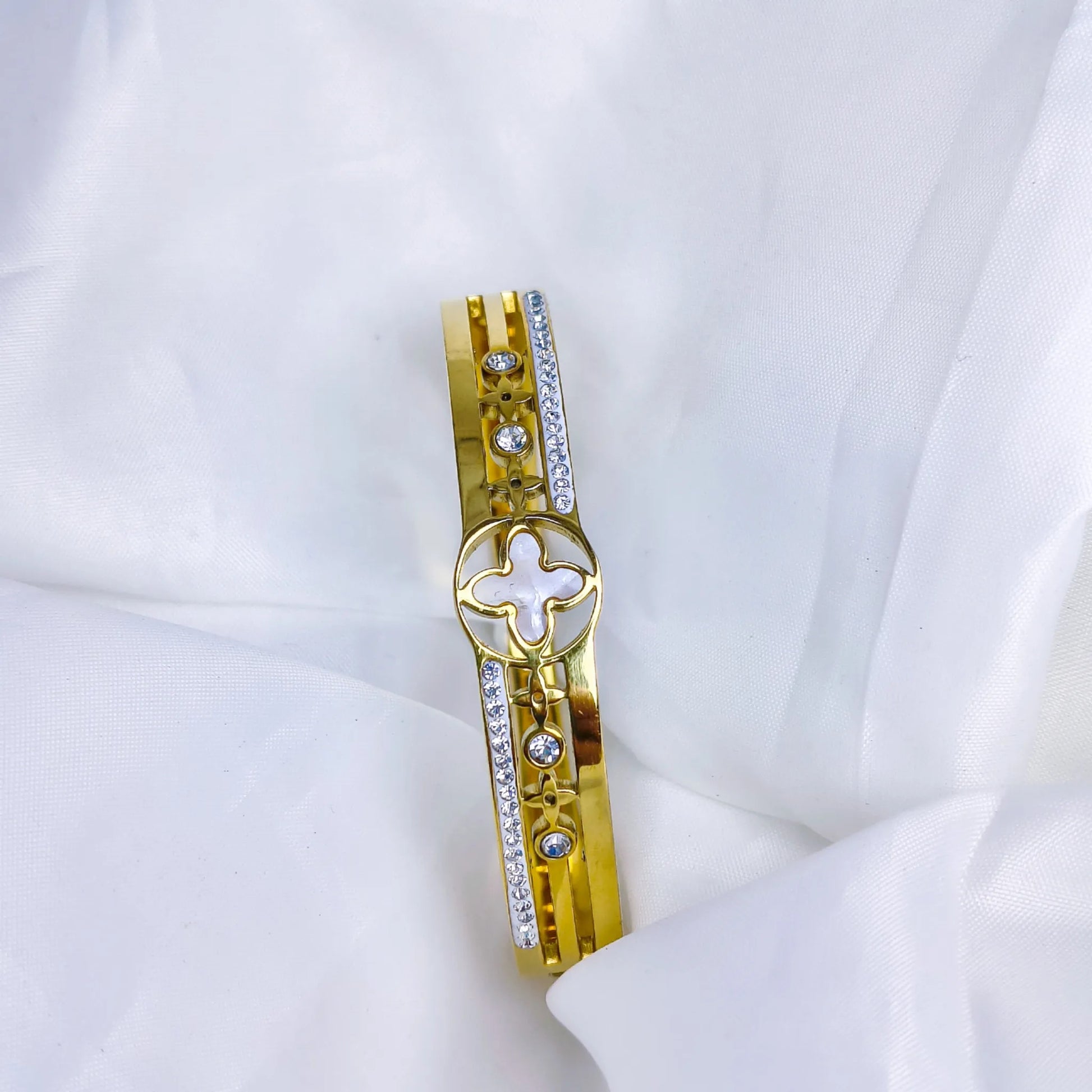 Anti Tarnish Gold Plated Kada Bracelet with White Stones & Designer Motif