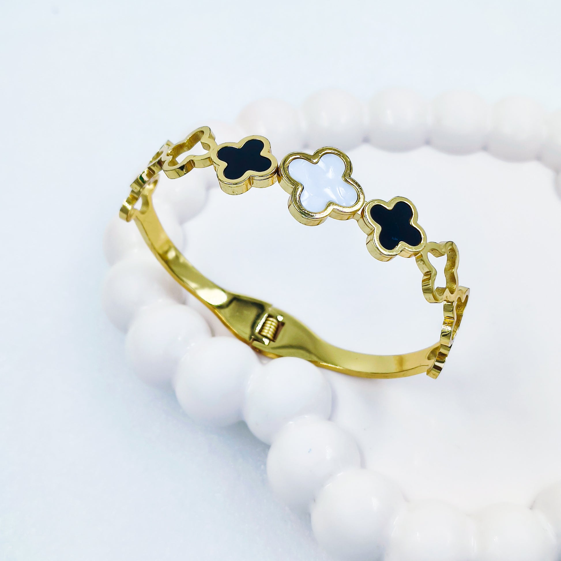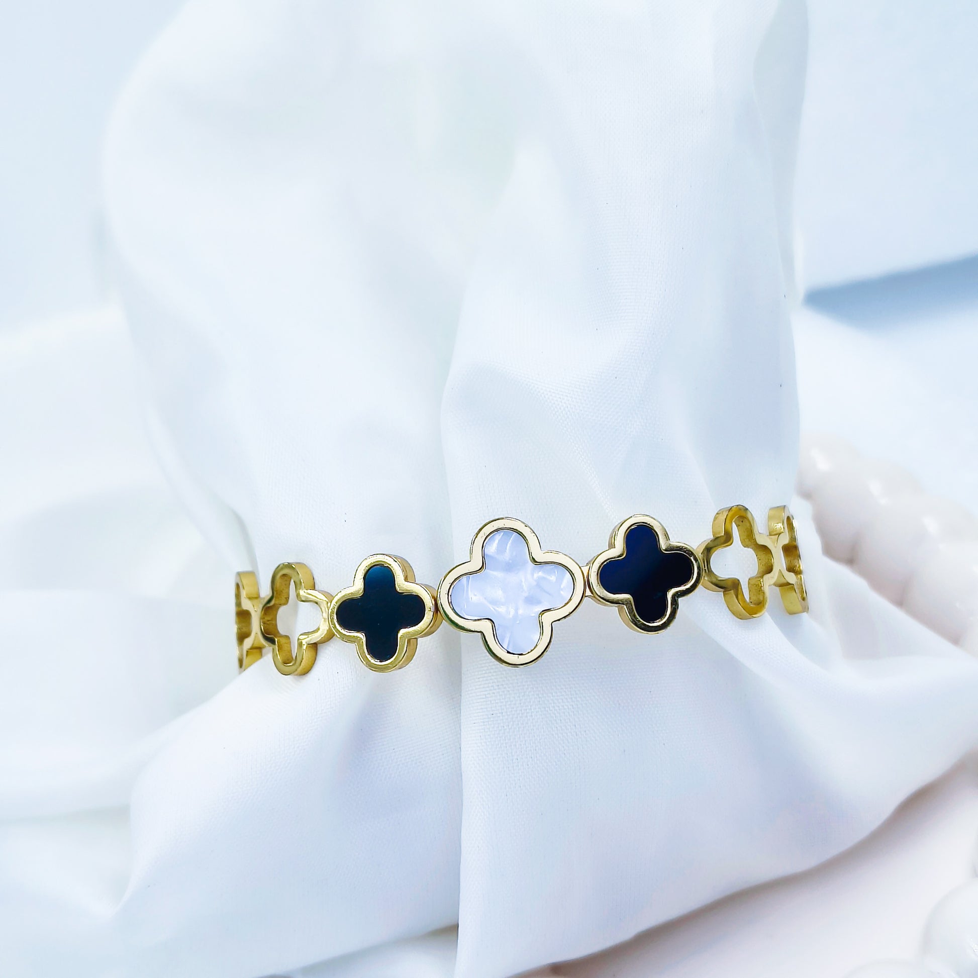 Elegant gold-toned bracelet featuring clover charms in black, white, and blue for a classic, stylish look. Available in regular size and 2.8. Anti-tarnish coating ensures long-lasting shine and durability.