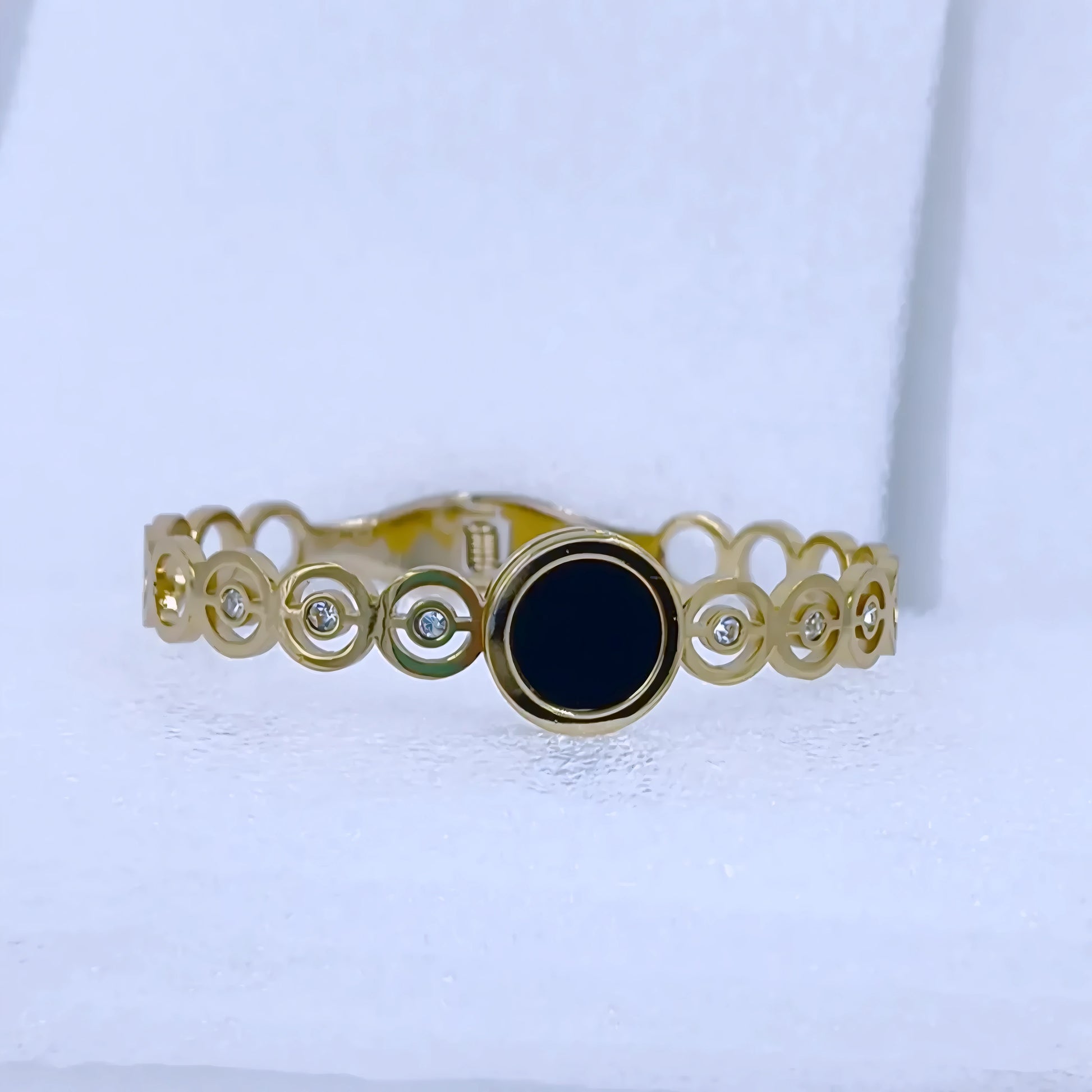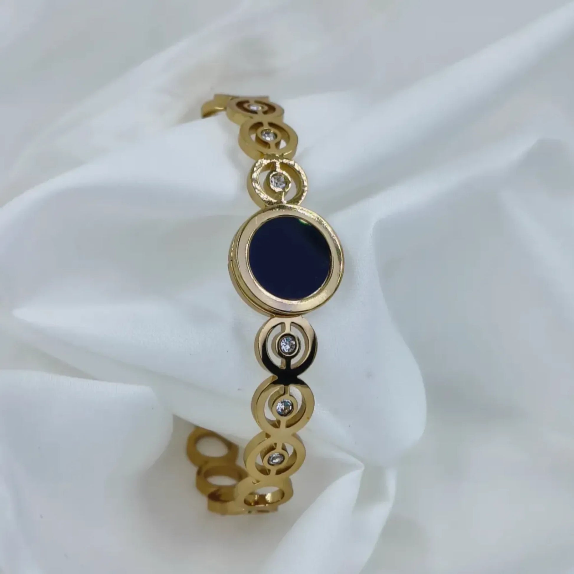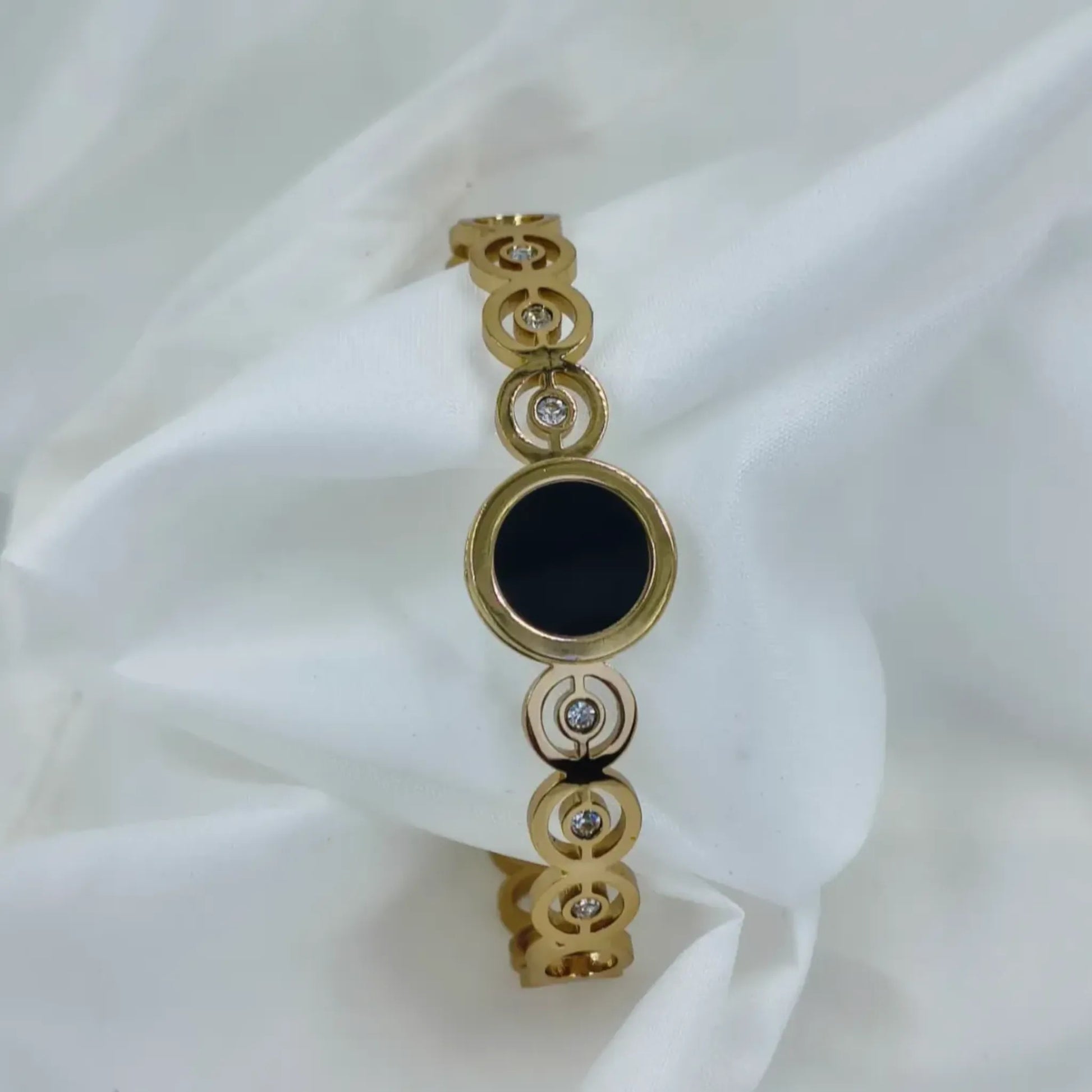 Add a touch of luxury to your style with this gold plated anti-tarnish kada/bracelet featuring a striking black stone centerpiece and sparkling accents. Designed for durability and everyday wear, this timeless bracelet stays shiny and tarnish-free, making it the perfect accessory for both casual and special occasions. Pair it with any outfit to elevate your look with classic elegance and modern charm. ✨💎