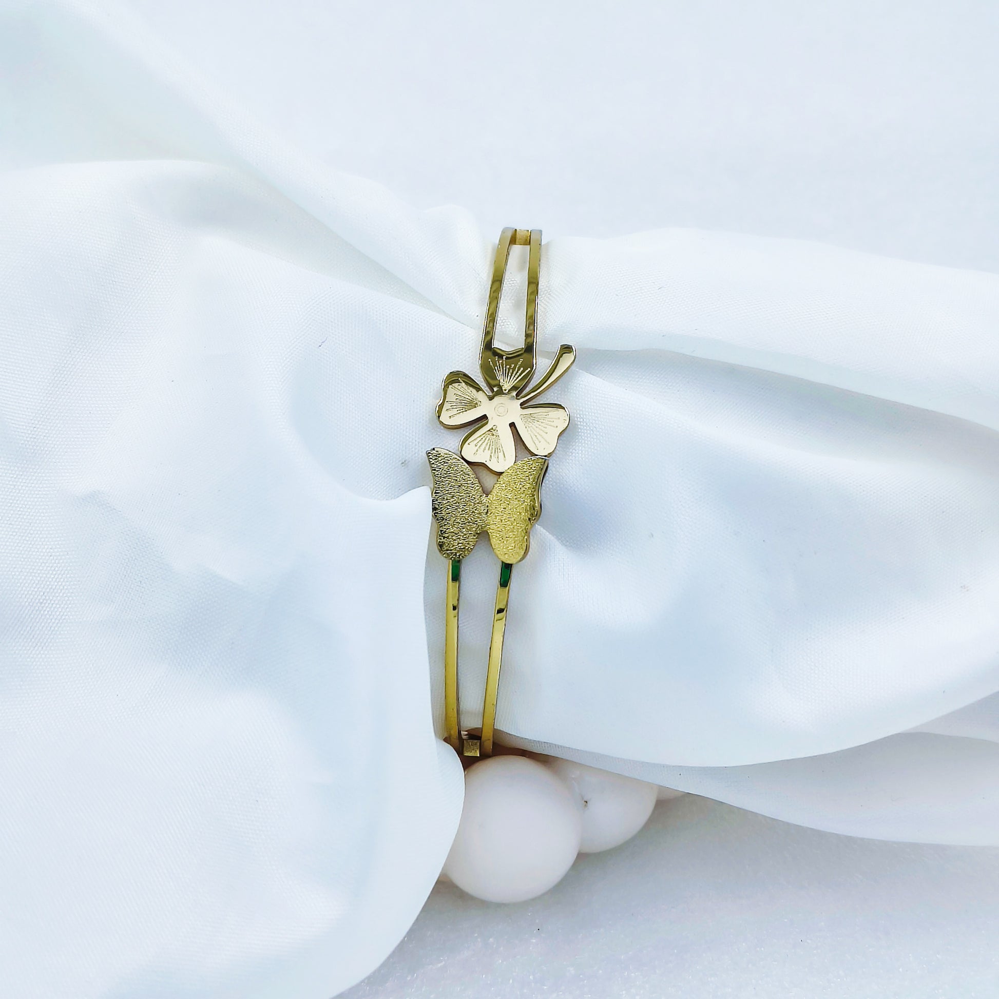 Charming gold plated bracelet featuring a floral motif paired with delicate butterfly accents. Available in regular size and 2.8. Anti-tarnish coated for long-lasting shine and graceful elegance.