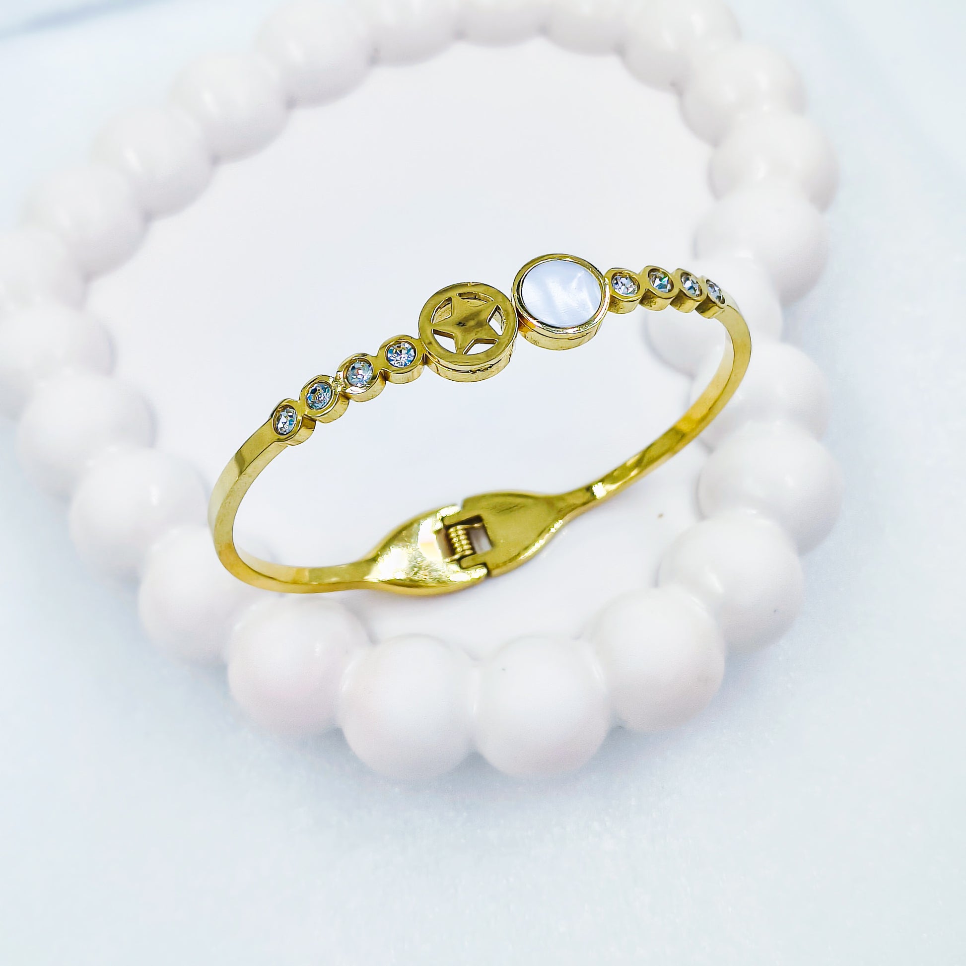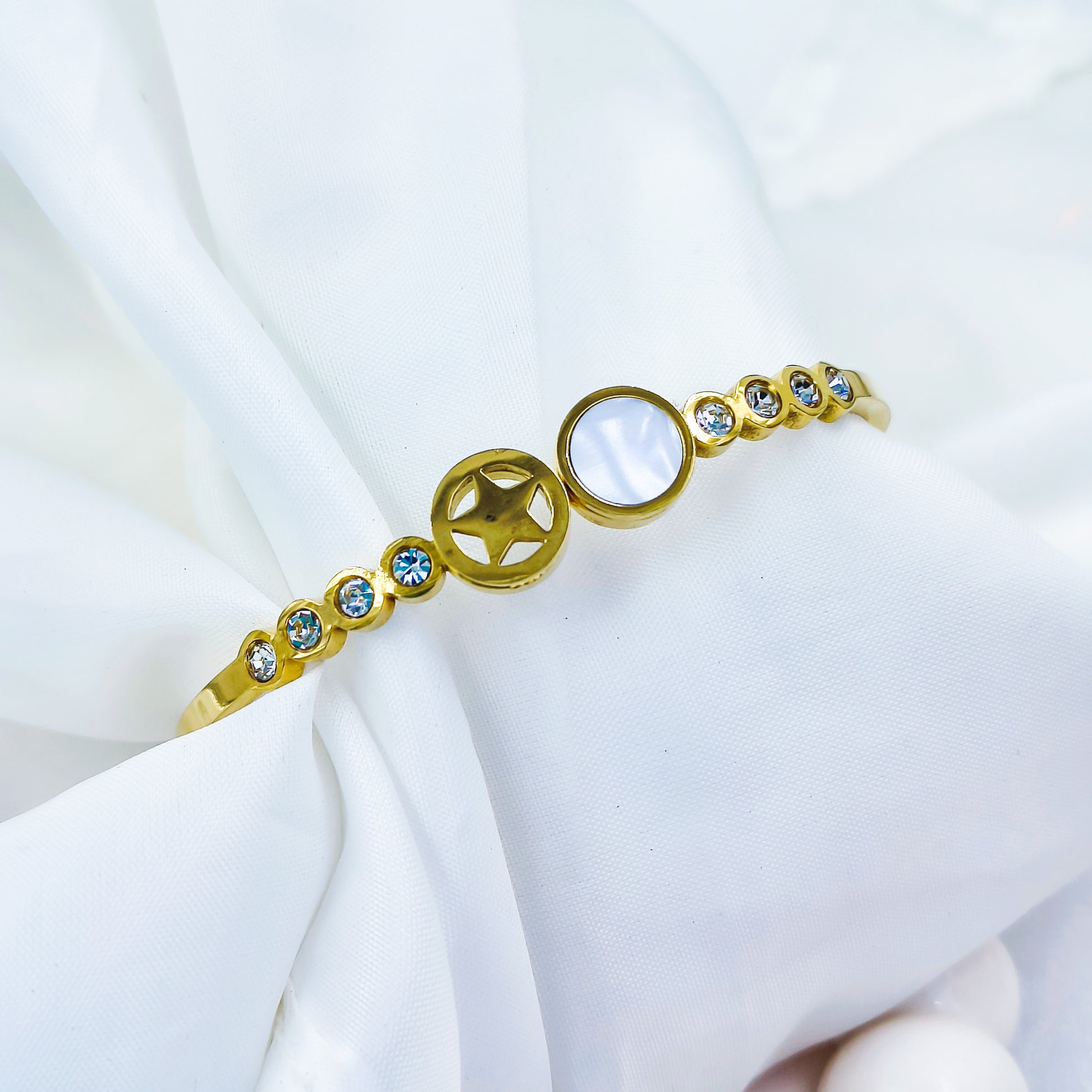 Elegant gold plated anti-tarnish kada designed with sparkling stones and a unique dual charm detail. Available in sizes 2.6 & 2.8, perfect for everyday wear and special occasions.
