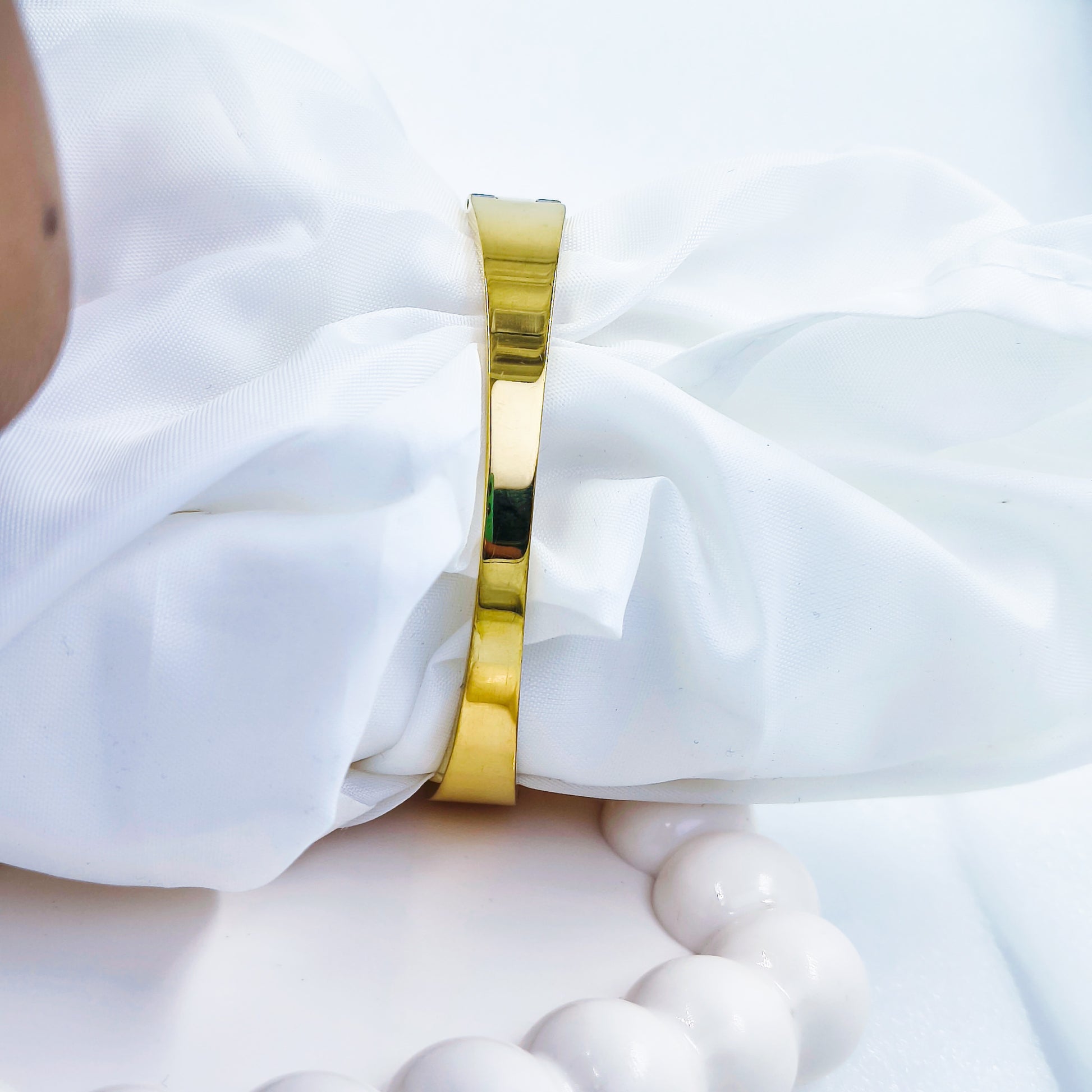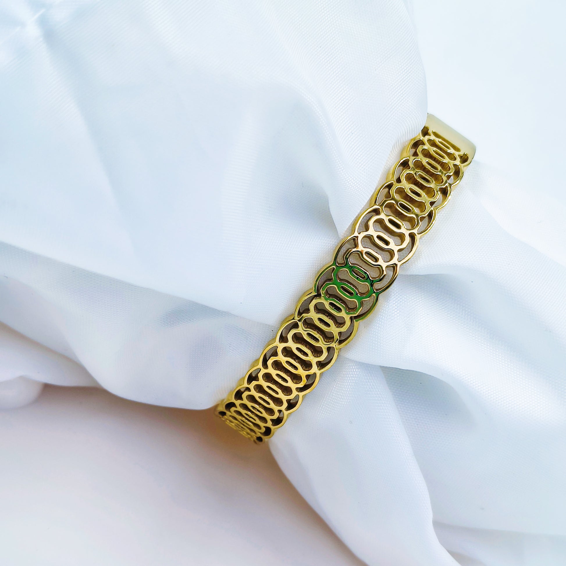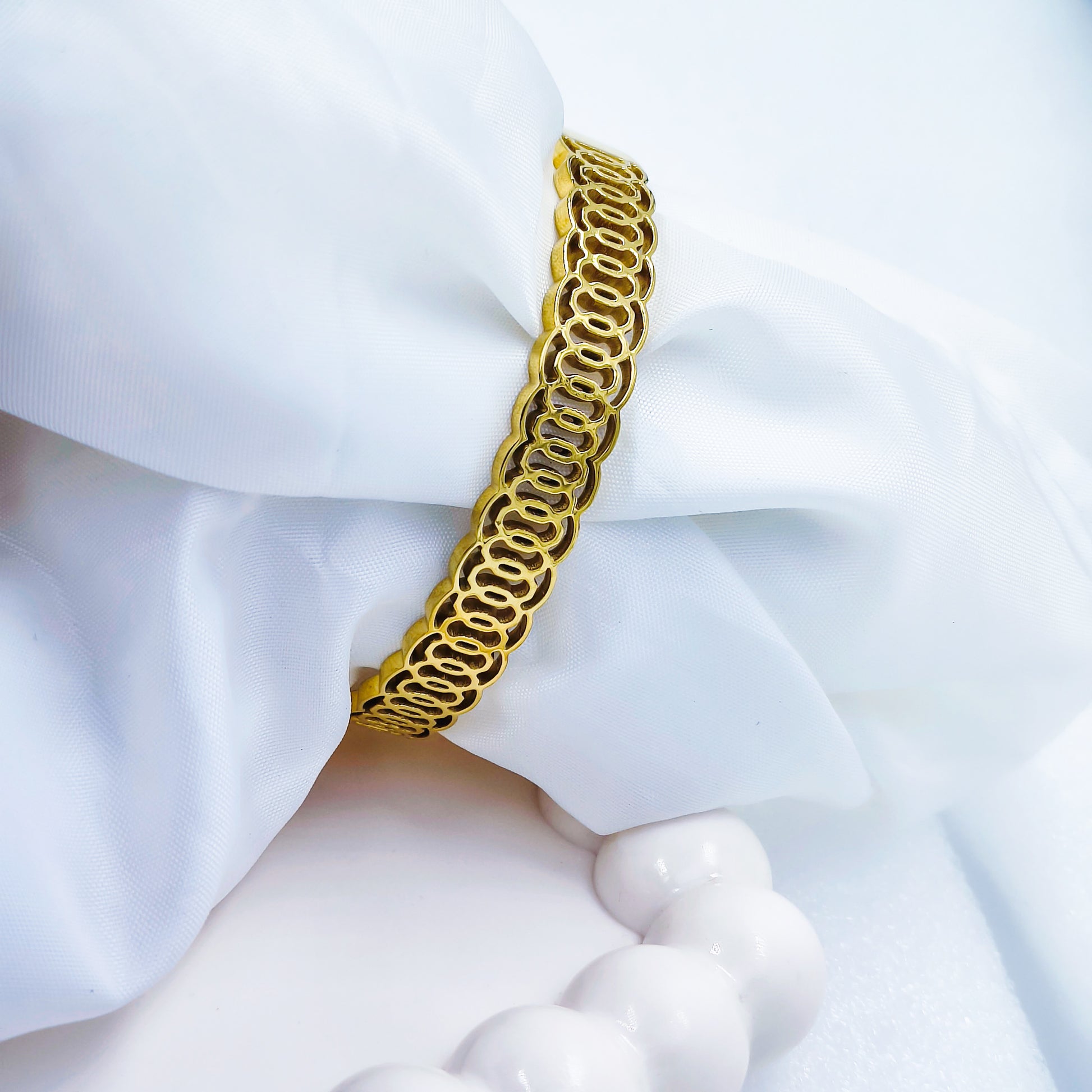 Trendy gold plated anti-tarnish kada with a unique chain-link inspired design for a bold and stylish look. Available in regular sizes 2.6 & 2.8, perfect to pair with both ethnic and western outfits.