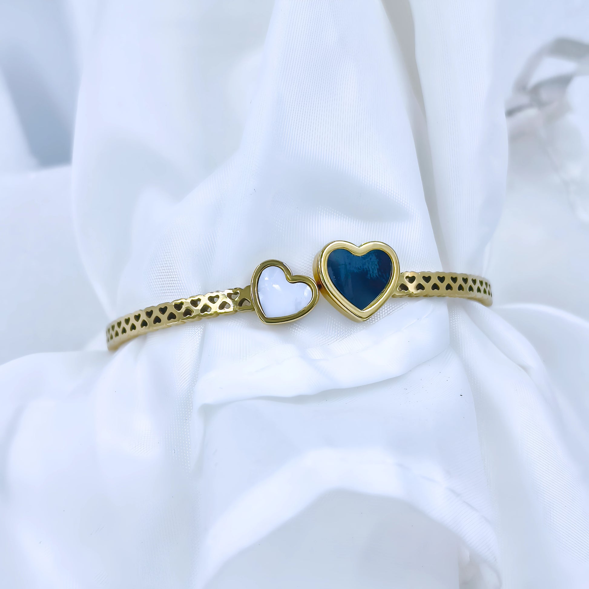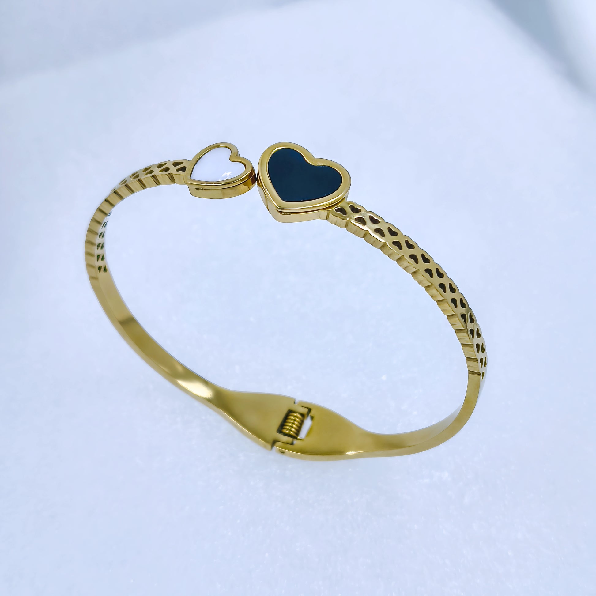 Express love and elegance with this Gold-Plated Dual Heart Kada Bracelet for women. Designed with two contrasting heart charms—one in glossy black and the other in white enamel—this kada/bracelet is a perfect blend of style and sophistication. The textured band adds a modern touch, making it ideal for both casual outings and special occasions. Crafted with premium anti-tarnish plating, it stays shiny and durable, ensuring long-lasting beauty. Lightweight and comfortable, this bracelet pairs effortlessly with both western and ethnic outfits.