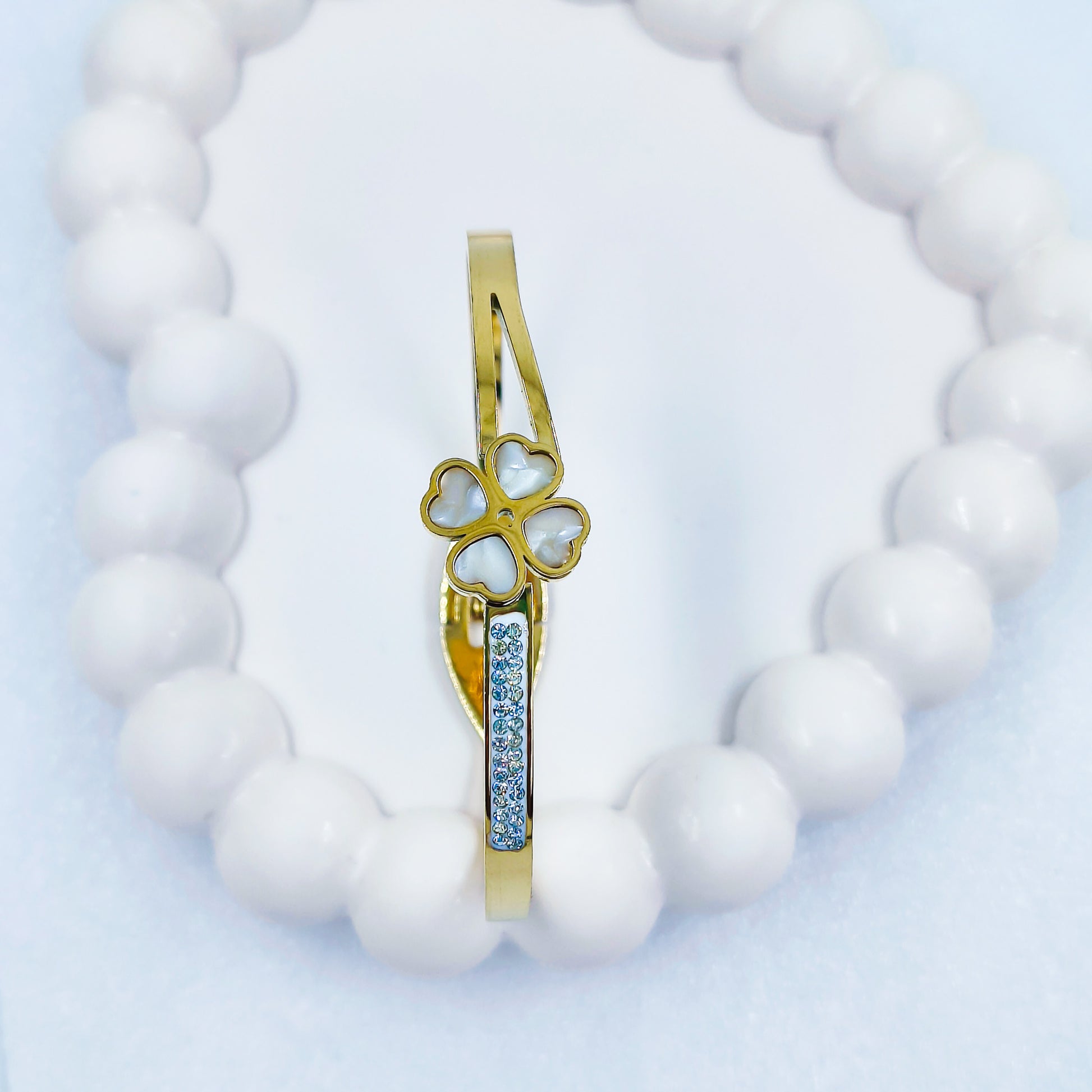 Chic gold plated anti-tarnish kada featuring a four-heart clover design with sparkling stone accents. Available in regular sizes 2.6 & 2.8, making it a perfect blend of elegance and charm.