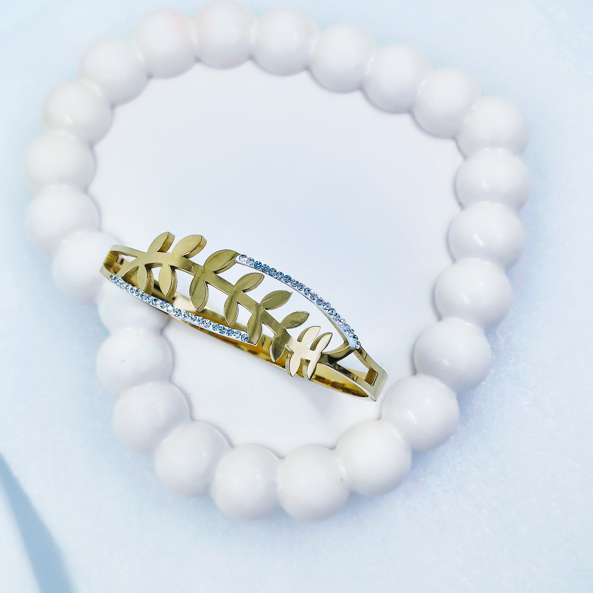 Elegant gold plated anti-tarnish kada featuring a bold leaf branch design highlighted with sparkling stone accents. Available in regular sizes 2.6 & 2.8, perfect for a classy and nature-inspired look.