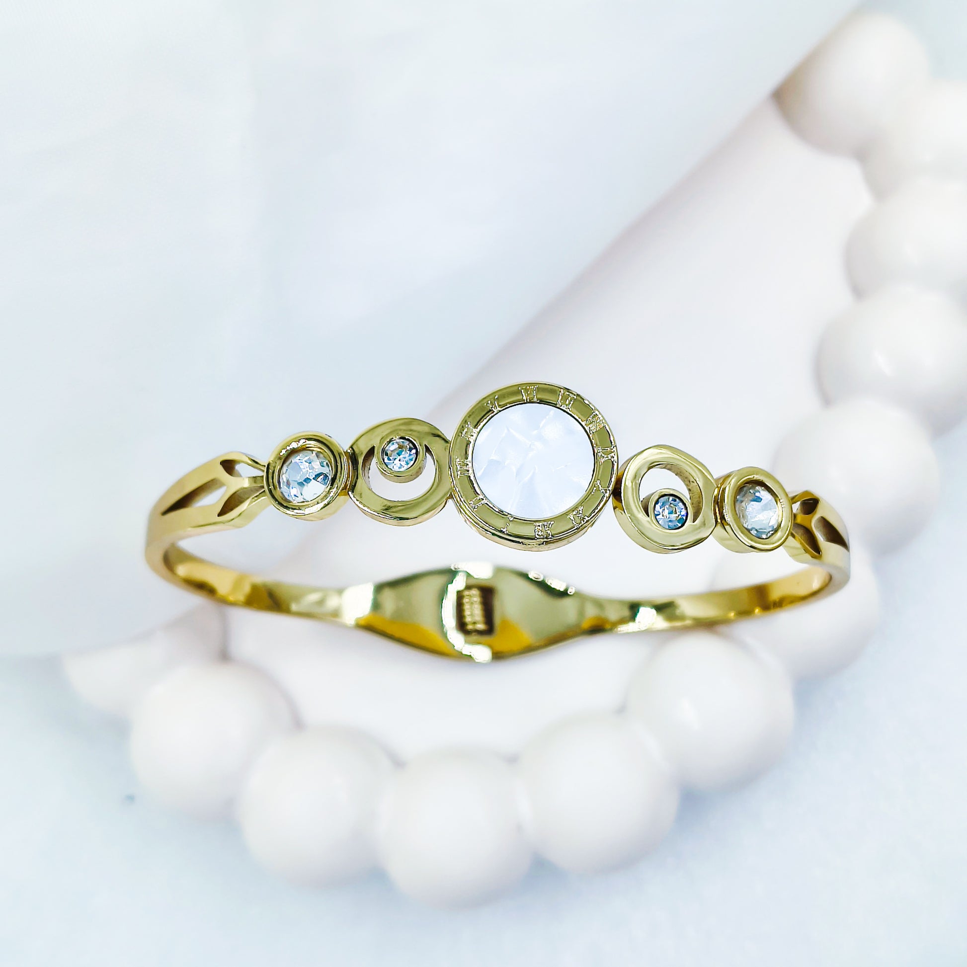 Elegant gold plated anti-tarnish kada featuring a classic circle design with shimmering stones and a white centerpiece. Available in regular sizes 2.6 & 2.8, perfect for timeless everyday elegance.