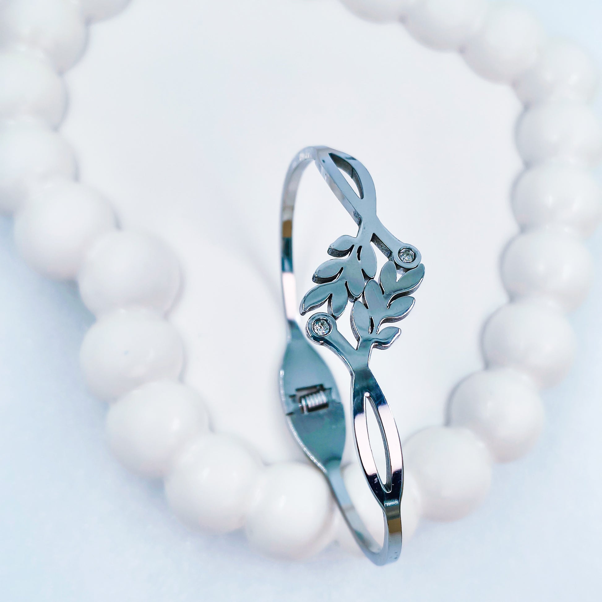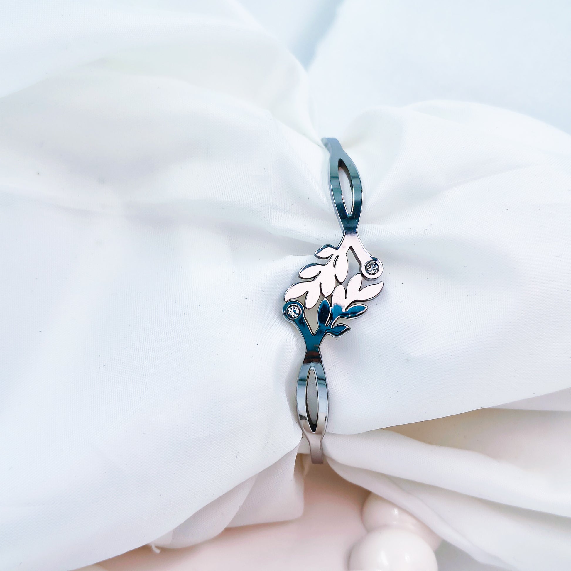 Stylish silver-toned bracelet with an elegant leaf pattern and sparkling stone accents. Available in regular size along with 2.6 & 2.8. Anti-tarnish coated for long-lasting shine and everyday sophistication.