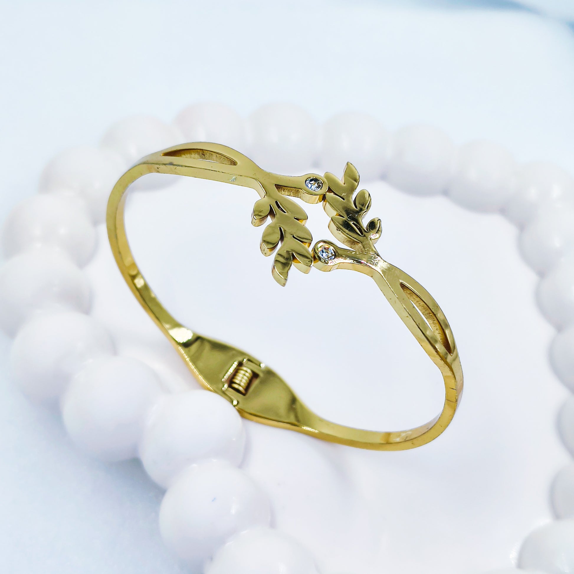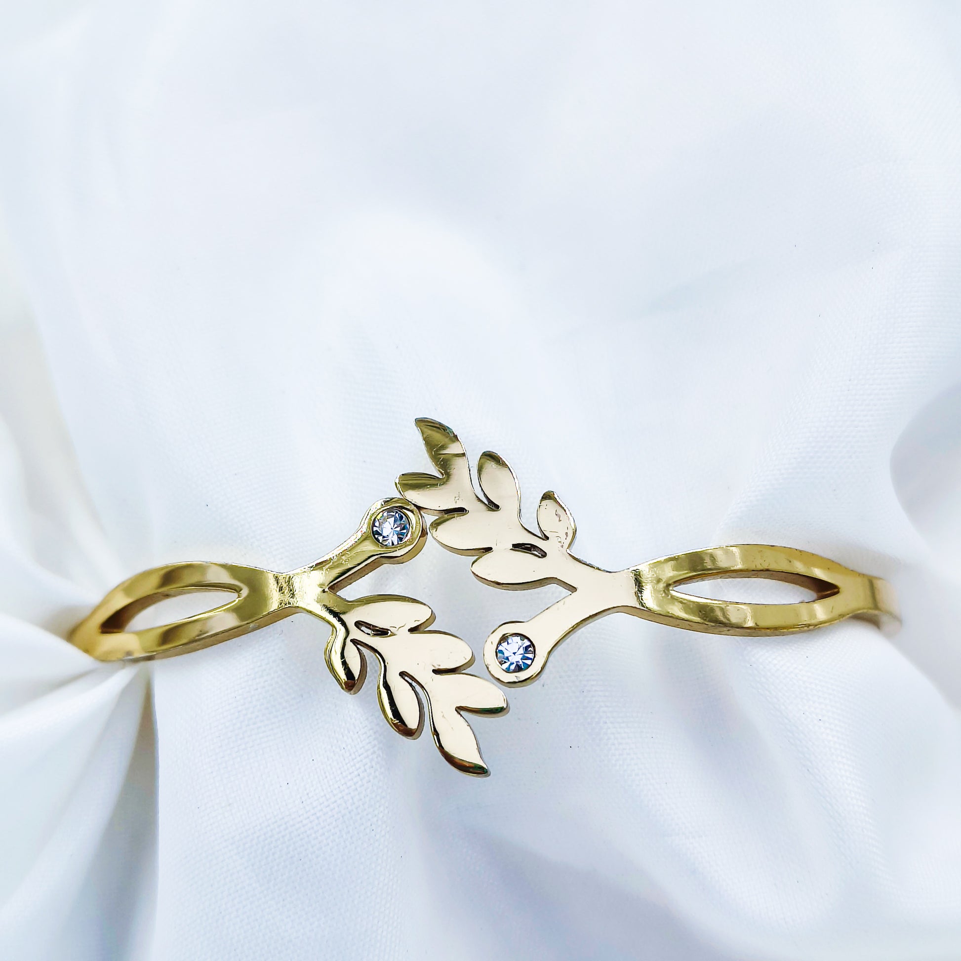 Elegant gold plated bracelet with a delicate leaf design and sparkling stone accents. Available in regular size and 2.8. Anti-tarnish coated for long-lasting shine and timeless beauty.