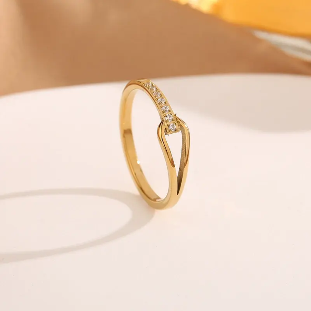 Delicate and modern, this gold-tone ring features a subtle twisted band design accented with a row of sparkling crystals. Its sleek silhouette makes it perfect for stacking or wearing solo as a refined statement.