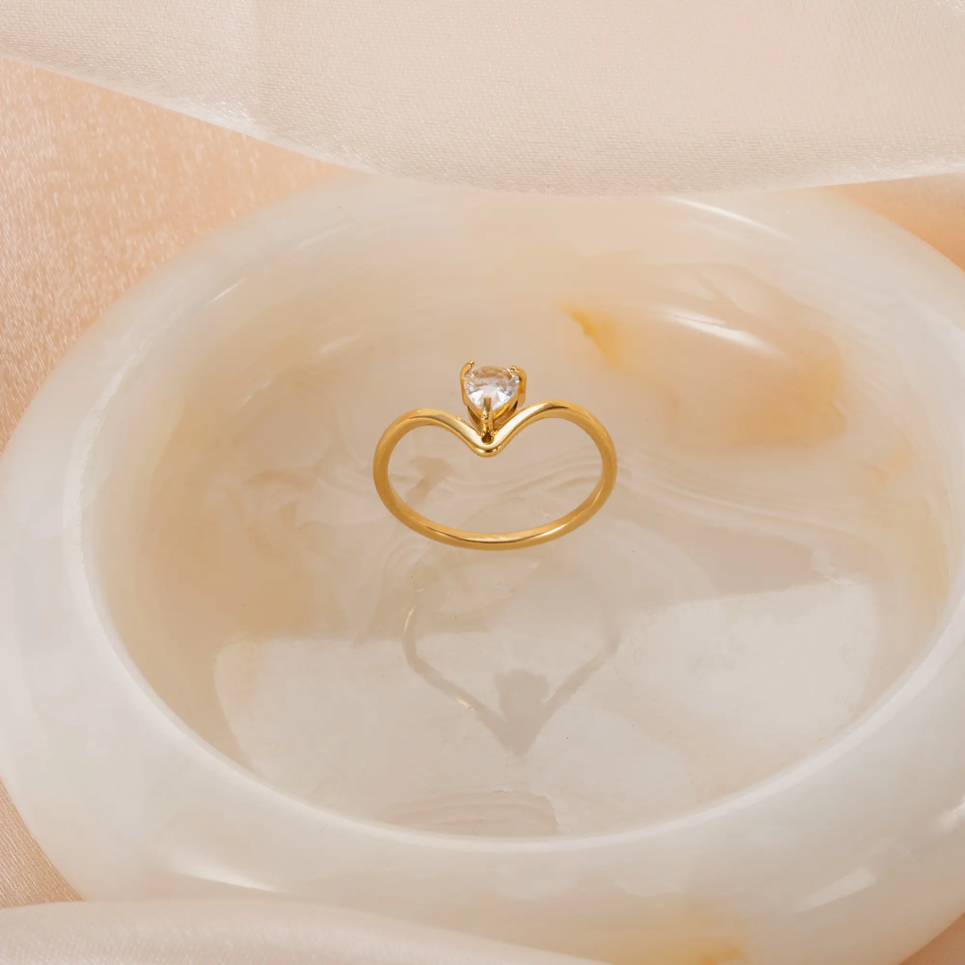 A minimalist gold-plated ring featuring a delicate V-shape design and a sparkling teardrop crystal centerpiece for an elegant, modern touch.