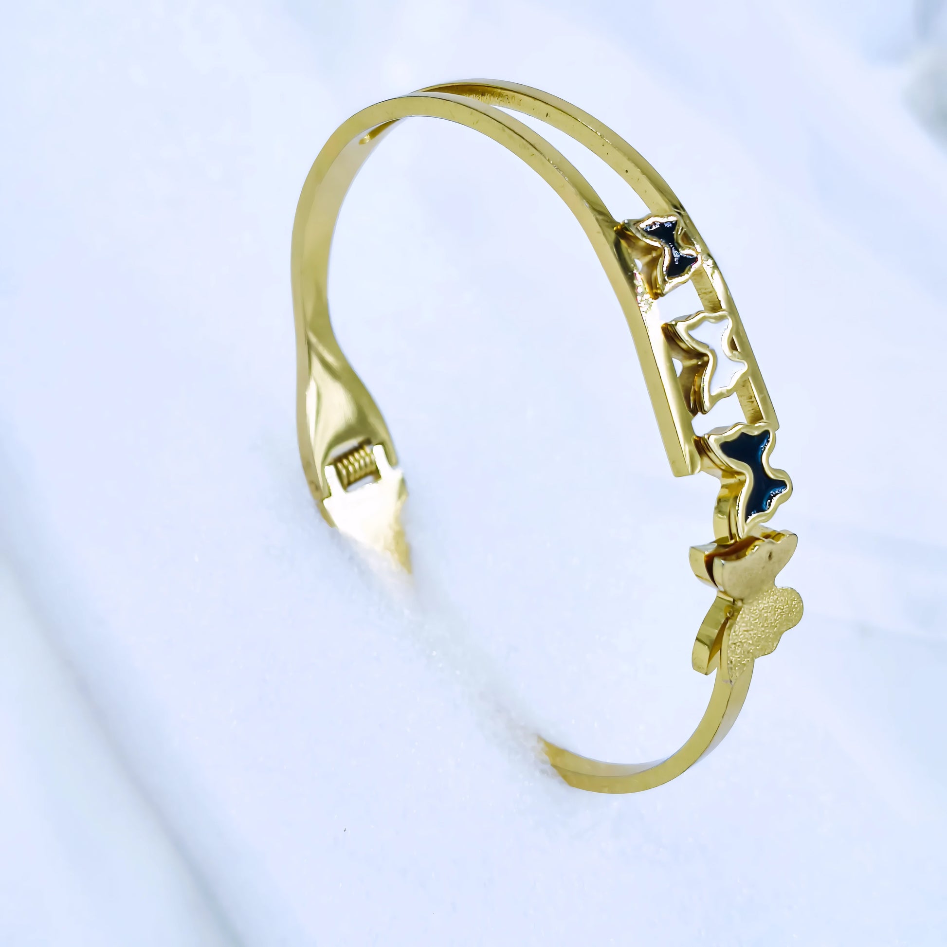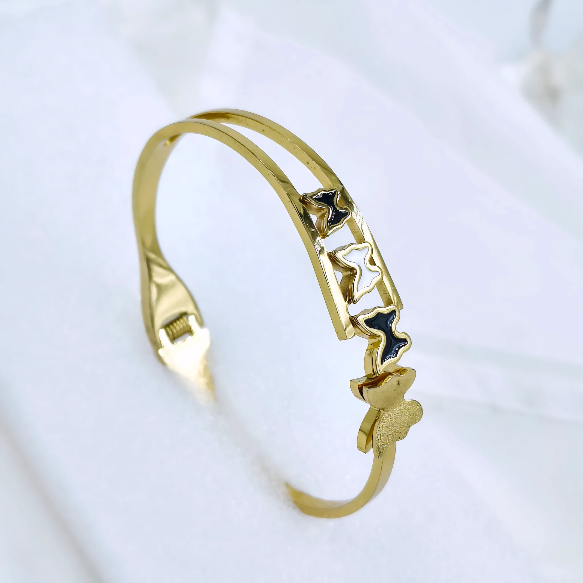 Embrace elegance with this Triple Butterfly Anti-Tarnish Gold Plated Kada/Bracelet. Designed with three charming butterfly motifs in dual tones, this bracelet adds a graceful and feminine touch to your style. The durable anti-tarnish coating ensures long-lasting shine, making it perfect for everyday wear, festive occasions, or gifting. Lightweight, trendy, and versatile — a beautiful pick for butterfly lovers!