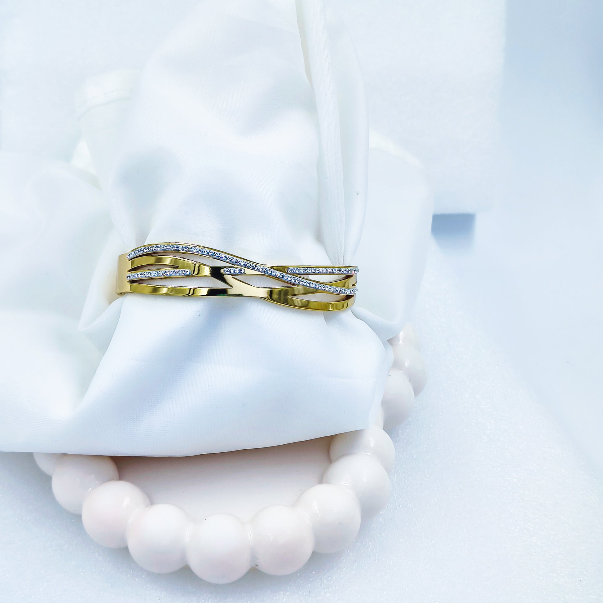 Luxurious gold plated bracelet featuring an elegant triple wave design embellished with sparkling crystals. Available in sizes 2.6, 2.8, and regular. Anti-tarnish coated for long-lasting shine and sophisticated charm.